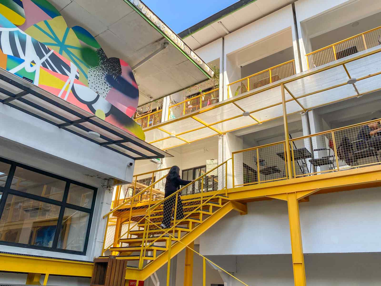 Area indoor dan outdoor artistik dengan mural warna-warni, bangku santai, dan spot kongko di bawah pohon beringin yang rindang